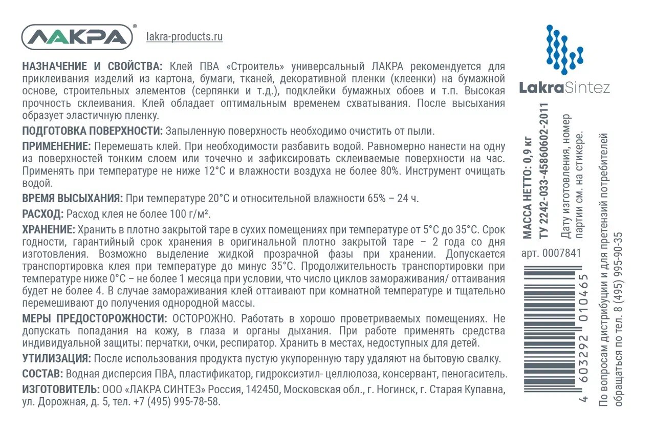 Клей ПВА Лакра Строитель, 900 г, 900 мл