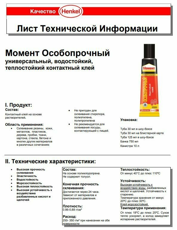 | Дополнительная информация | пригоден для склеивания стиропора, полиэтилена, полипропилена, пластифицированного ПВХ |