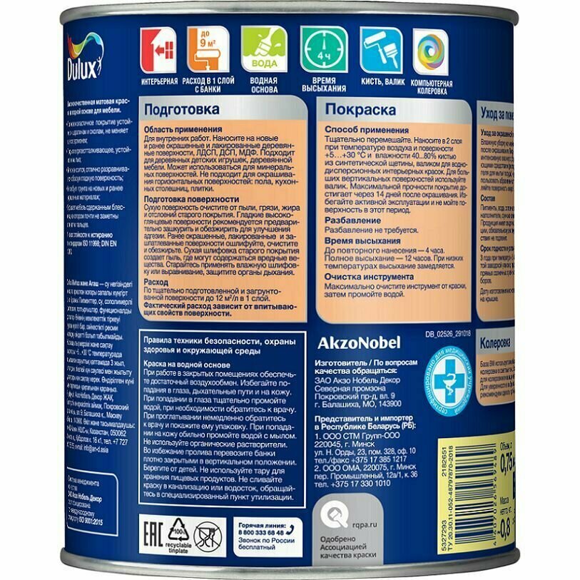 Dulux / Дюлакс Легко Обновить - Мебель и Дерево матовая износостойкая краска на водной основе (2л)