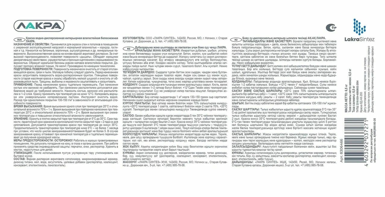 | Дополнительная информация | Краска акриловая для стен и потолков Лакра белоснежная 14кг |