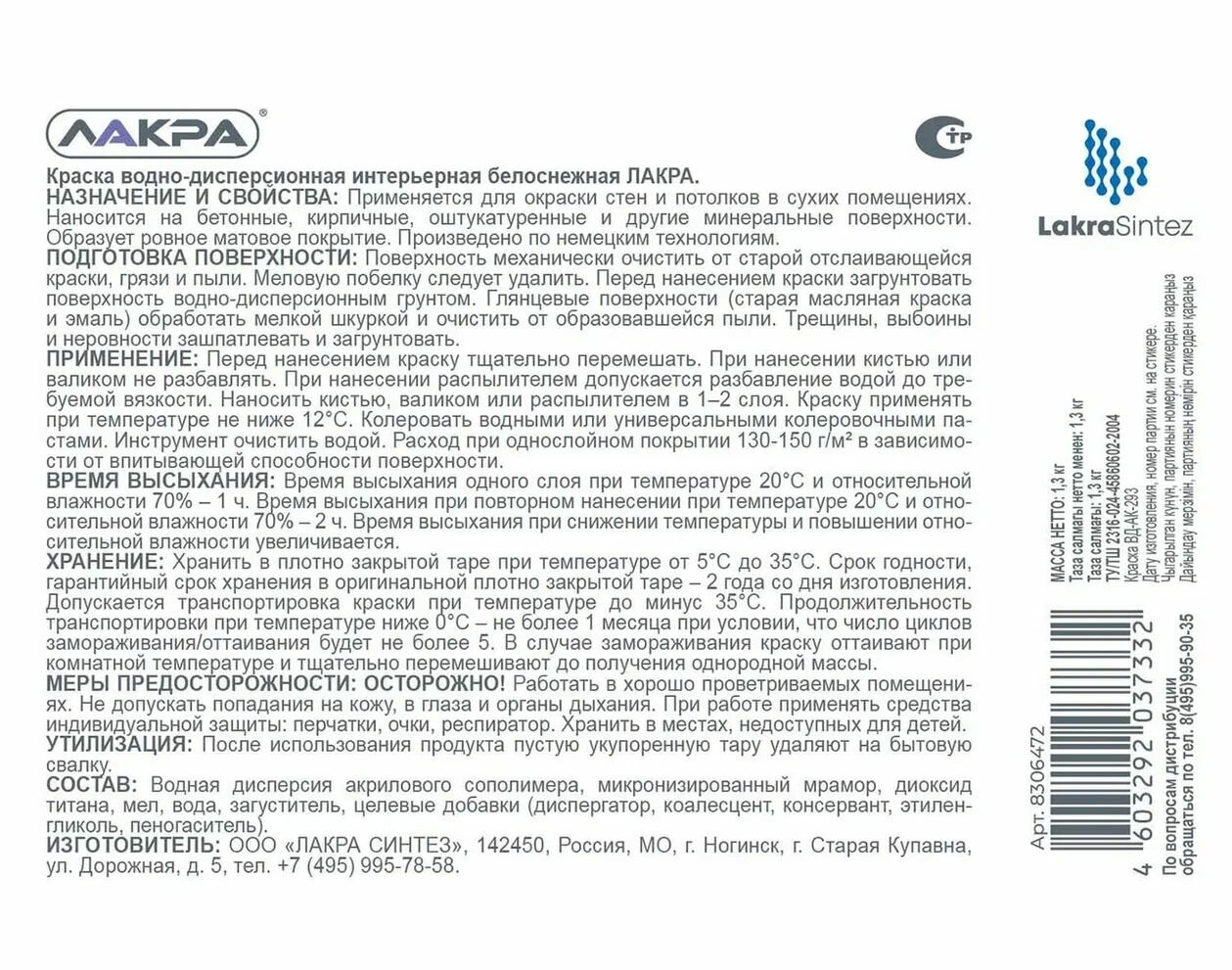 | Дополнительная информация | экологичная; без запаха; паропроницаемое покрытие; время высыхания одного слоя при температуре 20°С и относительной влажности 70% – 1 ч., при повторном нанесении – 2 ч; время высыхания при снижении температуры и повышении относительной влажности увеличивается |