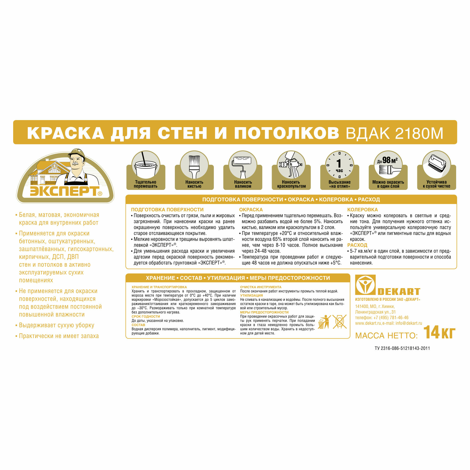 | Дополнительная информация | для окраски стен и потолков в активно эксплуатируемых сухих помещениях |