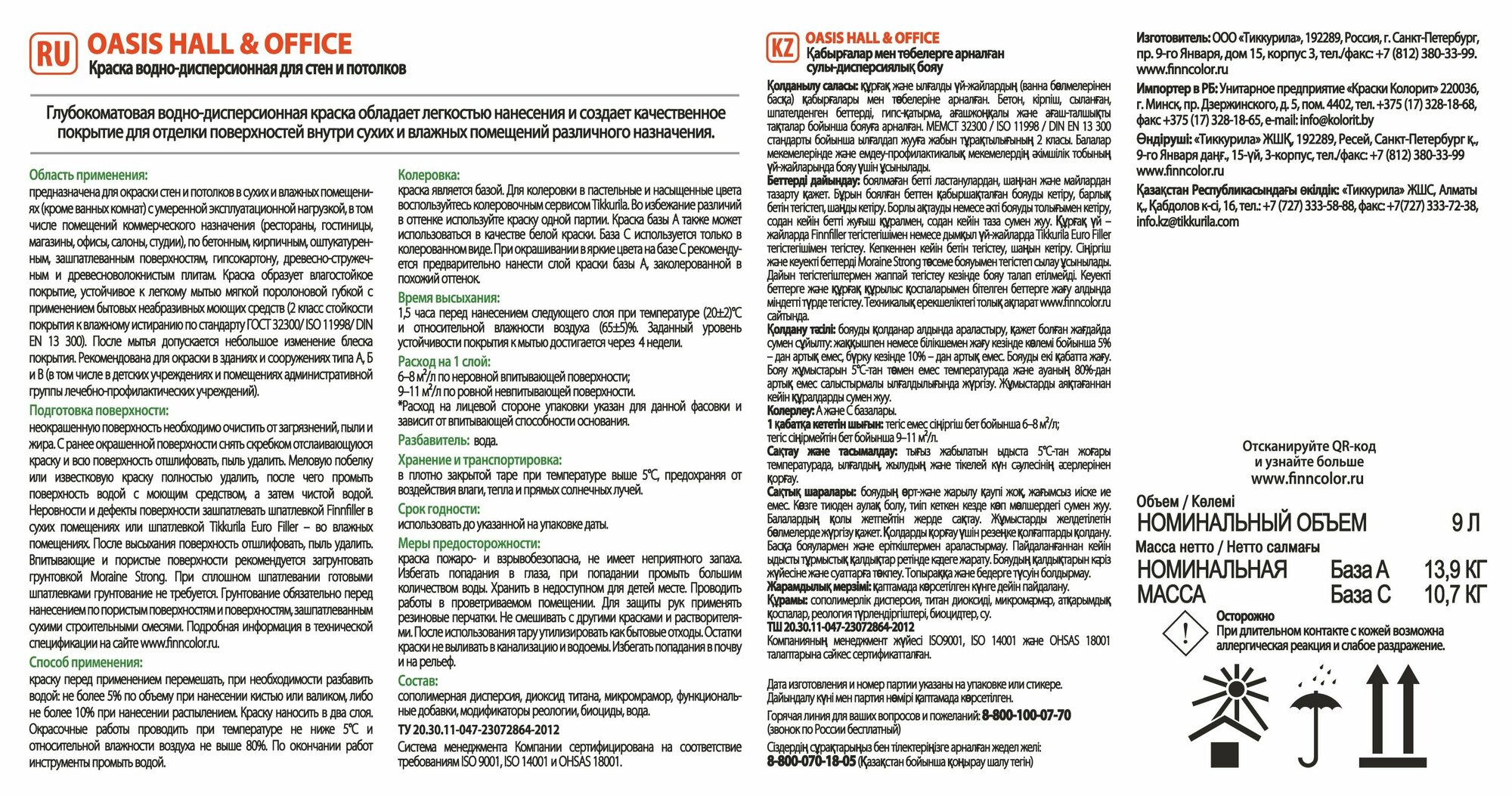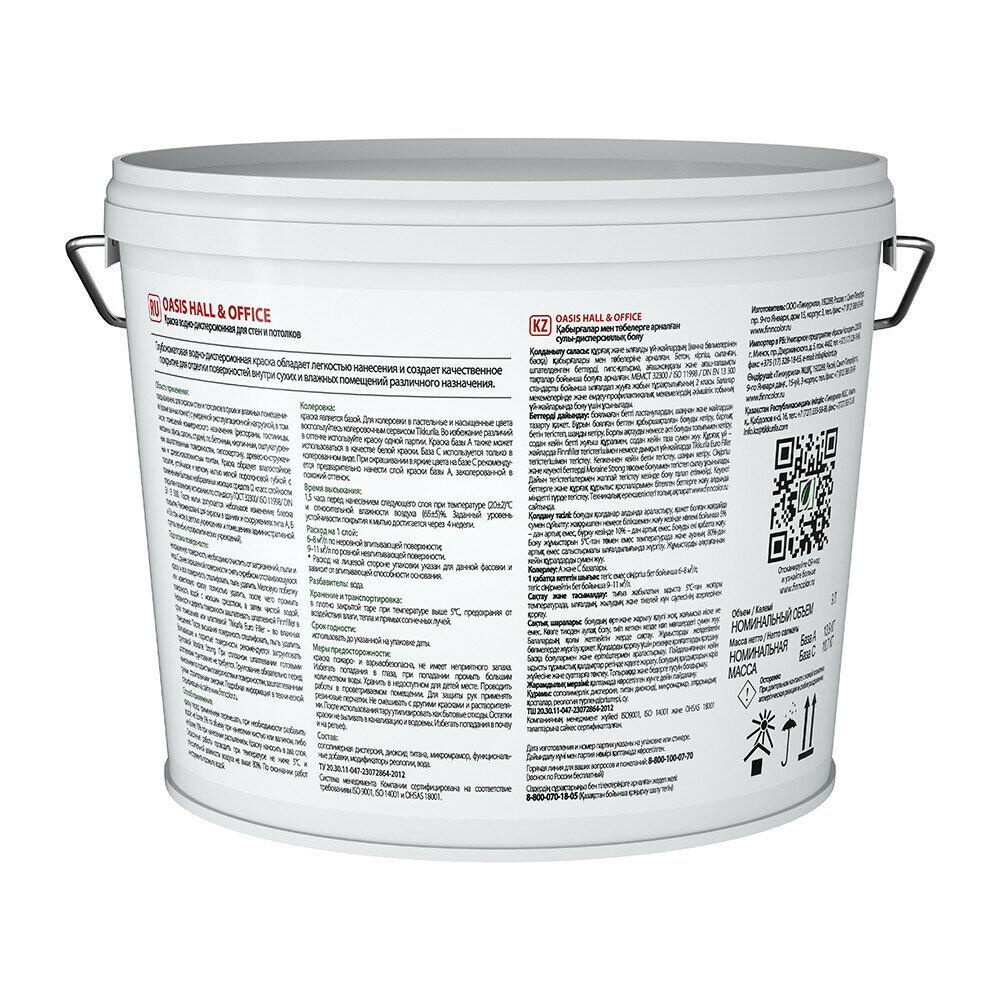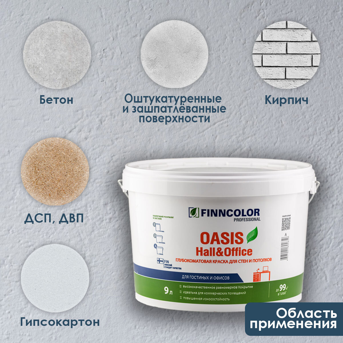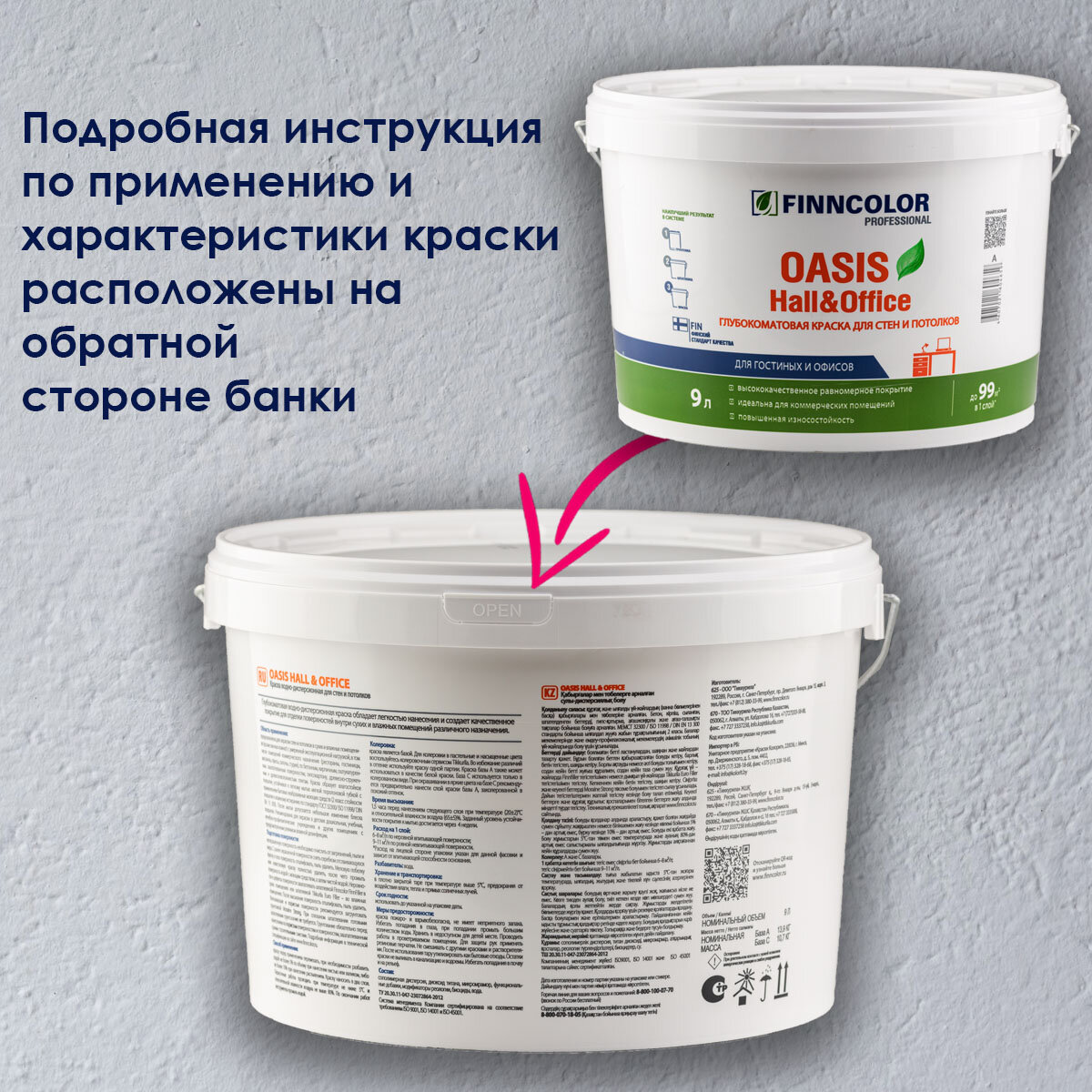 Краска FINNCOLOR OASIS HALL&OFFICE для стен и потолков, моющаяся, глубокоматовая, база С 9л