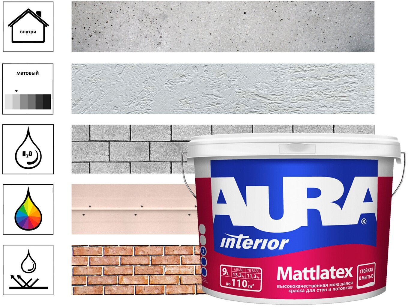 Краска воднодисперсионная, Aura, Mattlatex, акриловая, универсальная, моющаяся, влагостойкая, матовая, 9 л