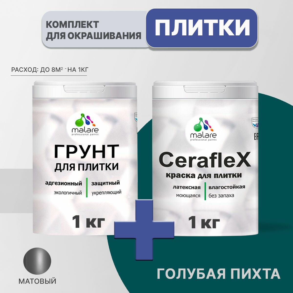 Купить Комплект Malare для окрашивания плитки и кафеля (1кг грунт + 1кг краска), акриловый, без запаха, быстросохнущий, матовый, цвет голубая пихта