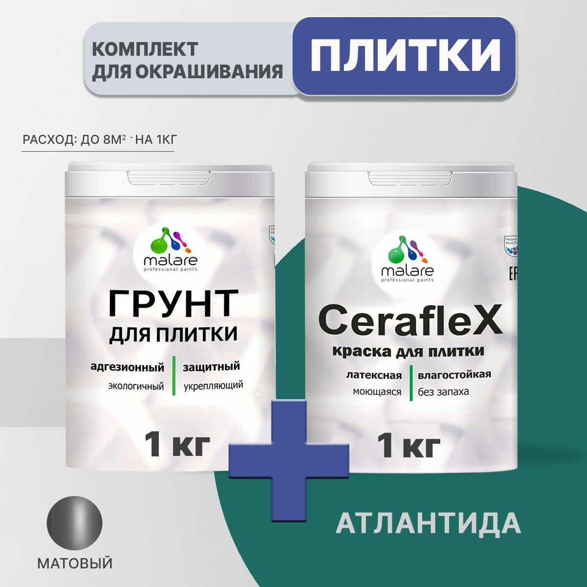 Комплект Malare для окрашивания плитки и кафеля (1кг грунт + 1кг краска), акриловый, без запаха, быстросохнущий, матовый, цвет агатовый серый