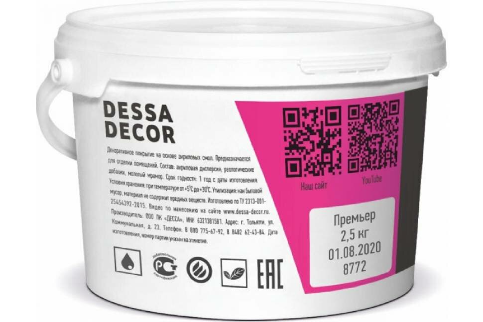 СохранитьАкриловая краска для стен DESSA DECOR Премьер 2,5 кг, супер белая, без шагрени, на основе мрамора, моющаяся, водоэмульсионная, фасадная, для стен и потолков интересное: