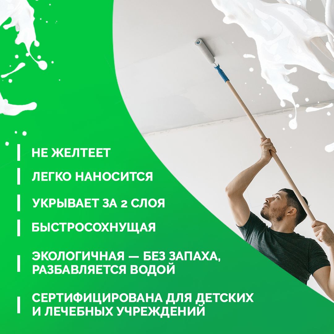 Краска MASTER FARBE супер белая акриловая для потолков в сухих помещениях, Быстросохнущая, Водоэмульсионная, Полуматовое, 14 кг, белый