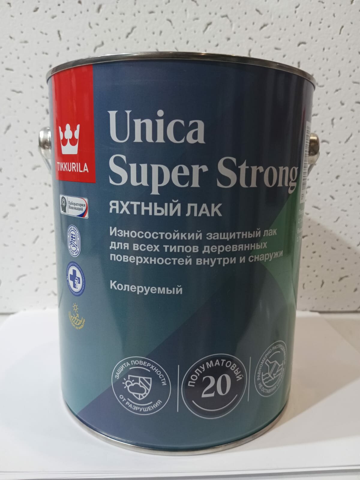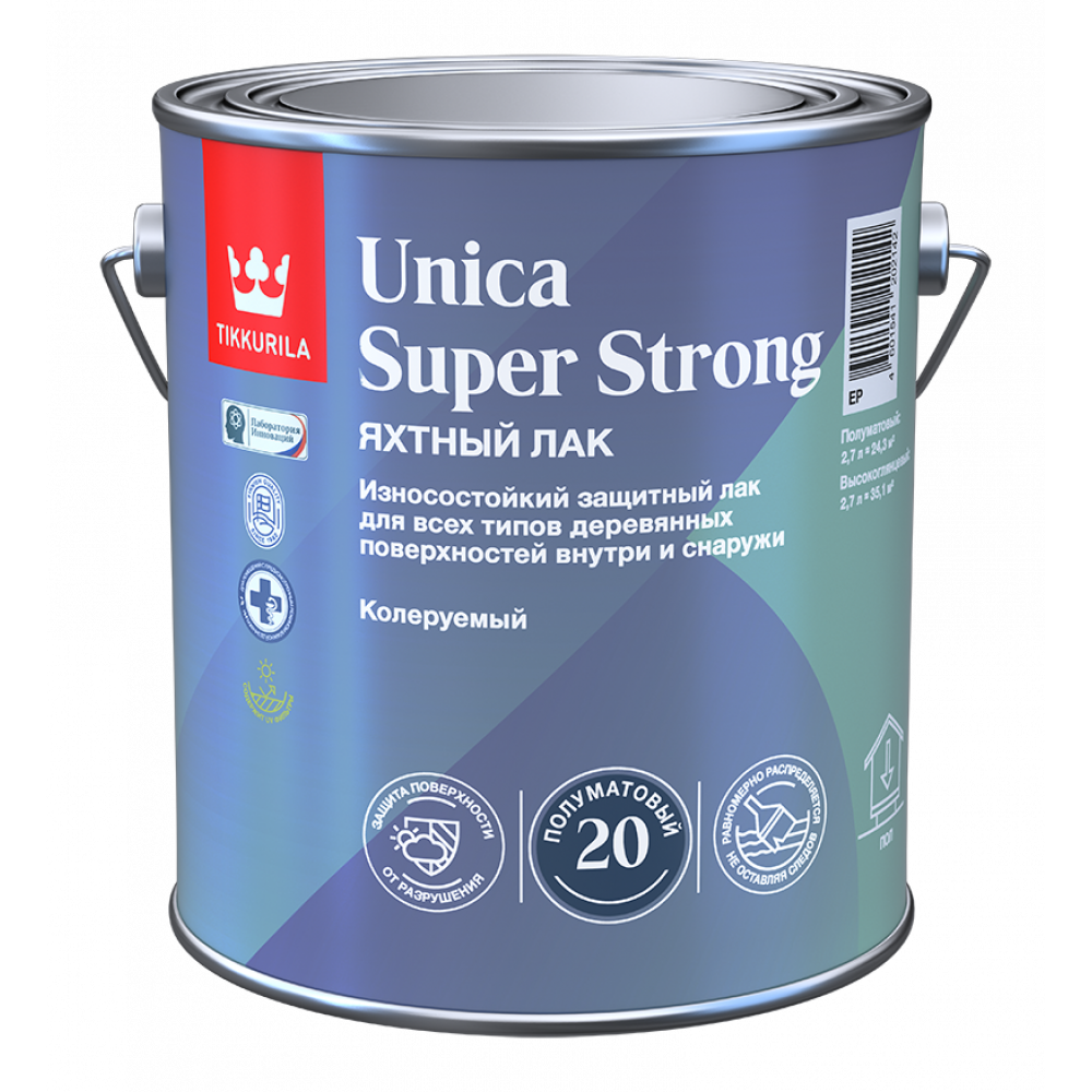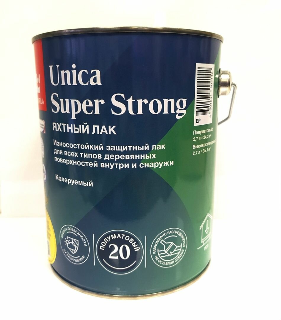 Лак уретано-алкидный Tikkurila Unica Super Strong 20, полуматовый, база EP, бесцветный, 2,7 л