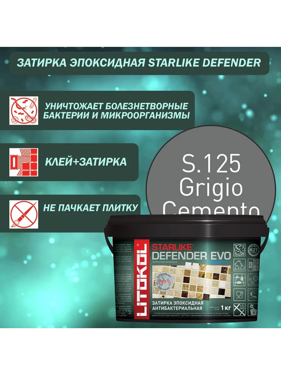 Затирка для плитки эпоксидная LITOKOL STARLIKE DEFENDER EVO (старлайк дефендер ЭВО) S.125 Grigio Cemento 1кг