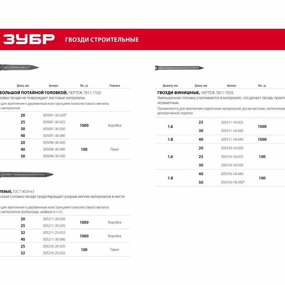 ЗУБР 25 х 1.6 мм, финишные гвозди, цинк, 100 гр (305316-16-025)
