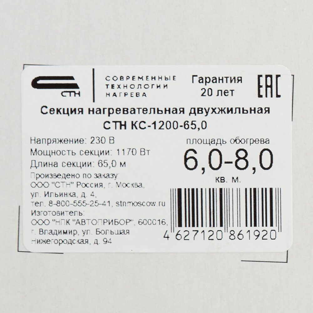 Теплый пол СТН Кабельная секция Квадрат Тепла 18Вт/м. п. 2ж СТН КС-1200 1200Вт/65м