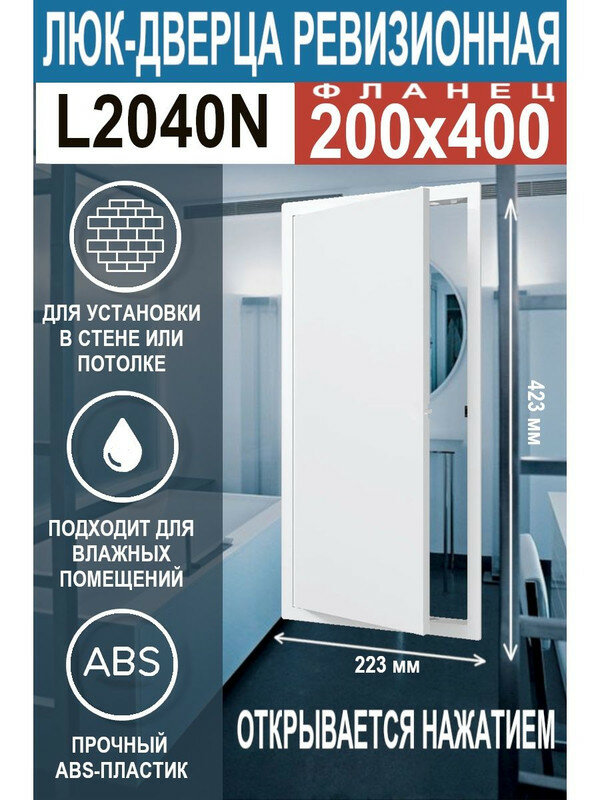 Люк-дверца ревизионная Evecs L2040N, ABS-пластик, нажимная, с фланцем 200 x 400 мм, 223 x 423 мм