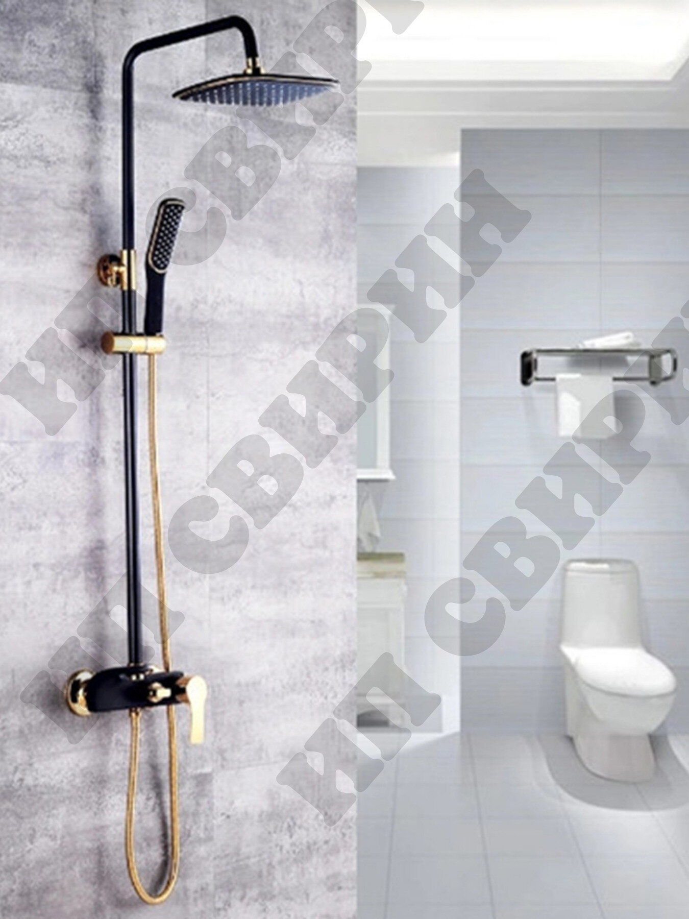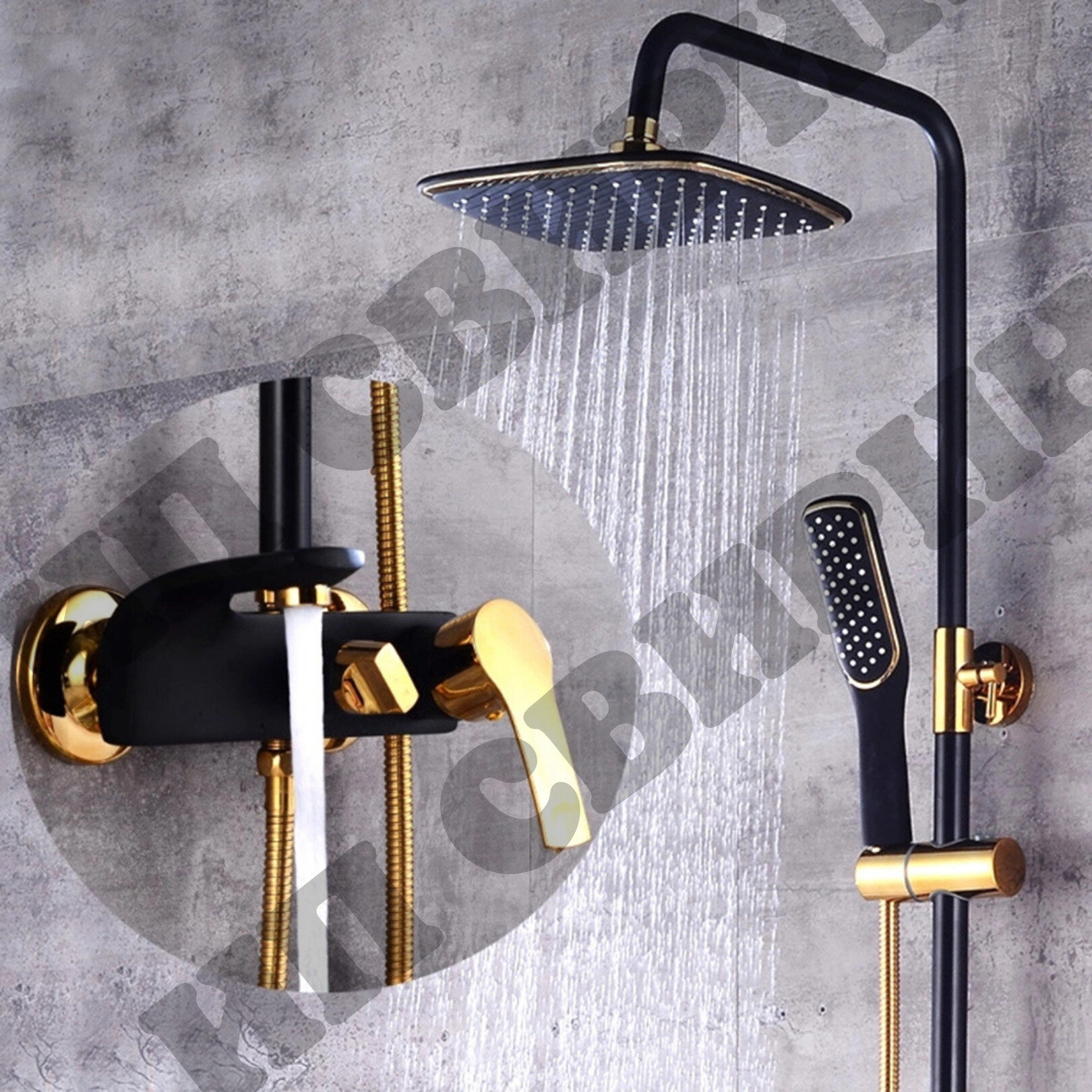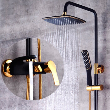 Душевая система с тропическим душем MATRIX настенная со смесителем чёрный, черная душевая стойка, комплект тропический душ и смеситель золотой