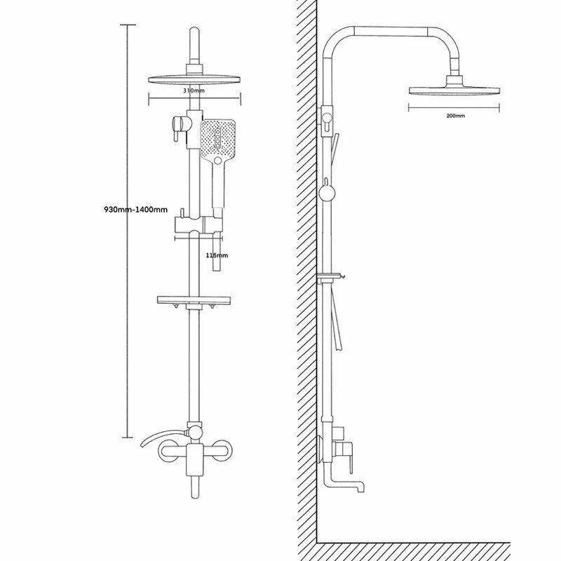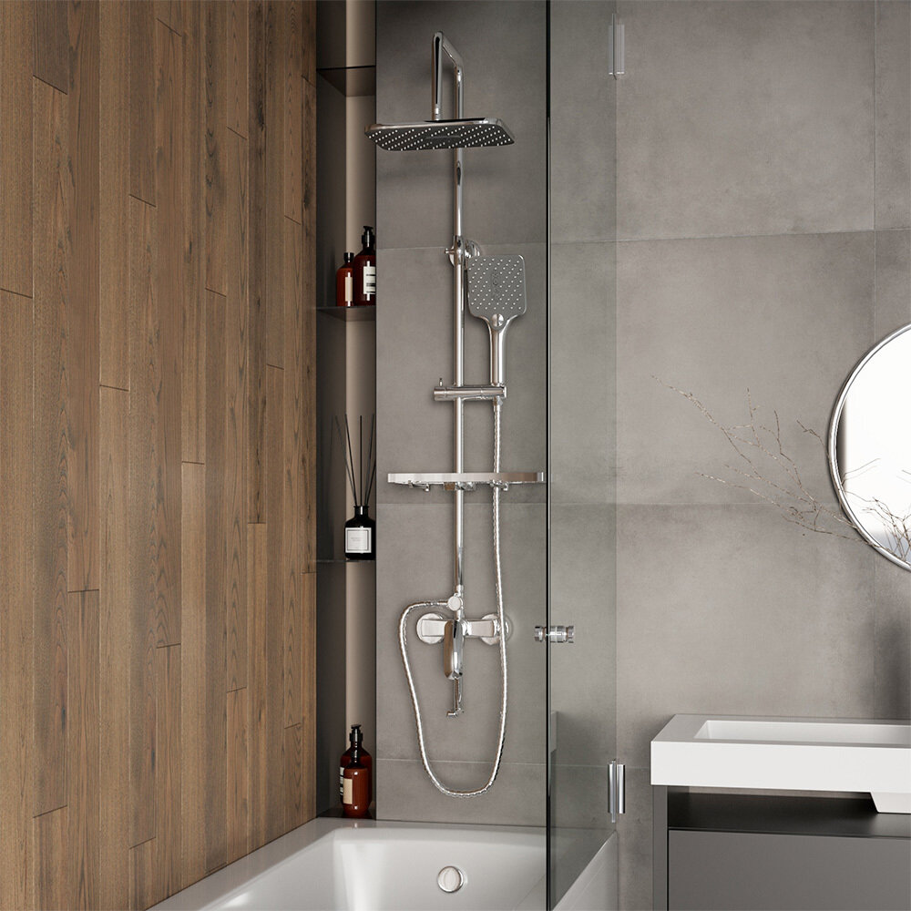| Комплектация | верхний душ / держатель лейки / дивертор / душевая штанга / излив для набора воды / лейка / набор эксцентриков / настенный держатель / отражатель / полочка / Смеситель / шланг / эксцентрик |