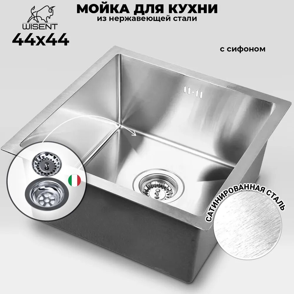 Кухонная мойка из нержавеющей стали WISENT WS34444 (44*44 см) в комплекте с итальянским сифоном WISENT GER010