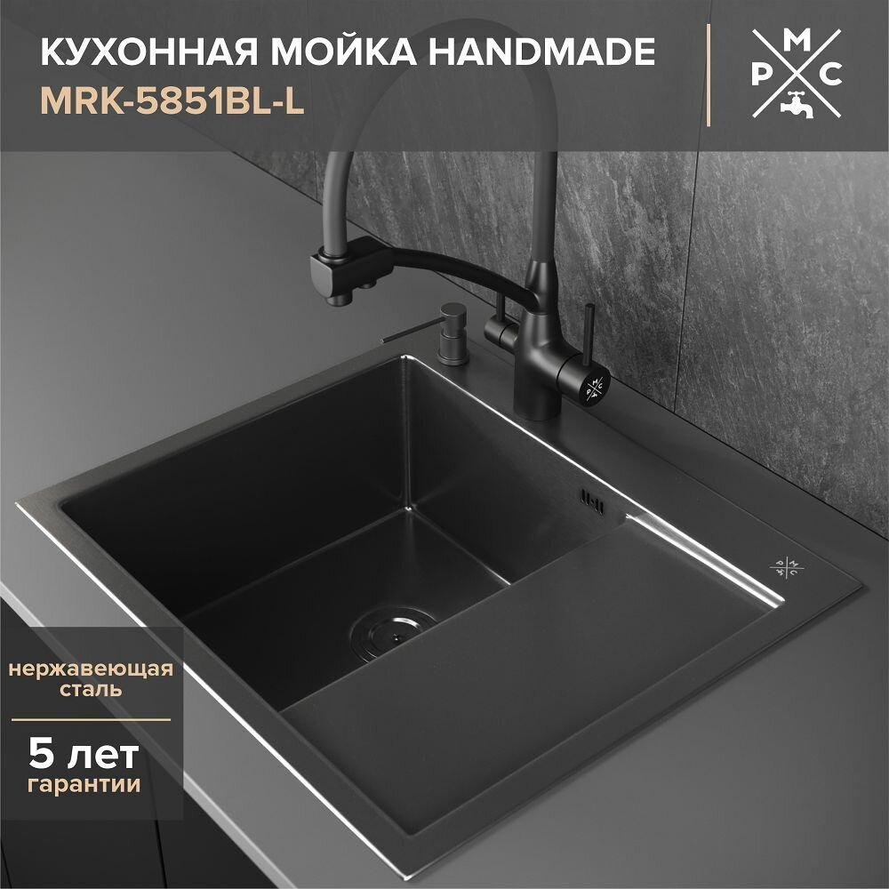 Купить Кухонная мойка, РМС MRK-5851BL-L, нержавеющая сталь, с правым крылом, дозатор, сифон, гарантия
