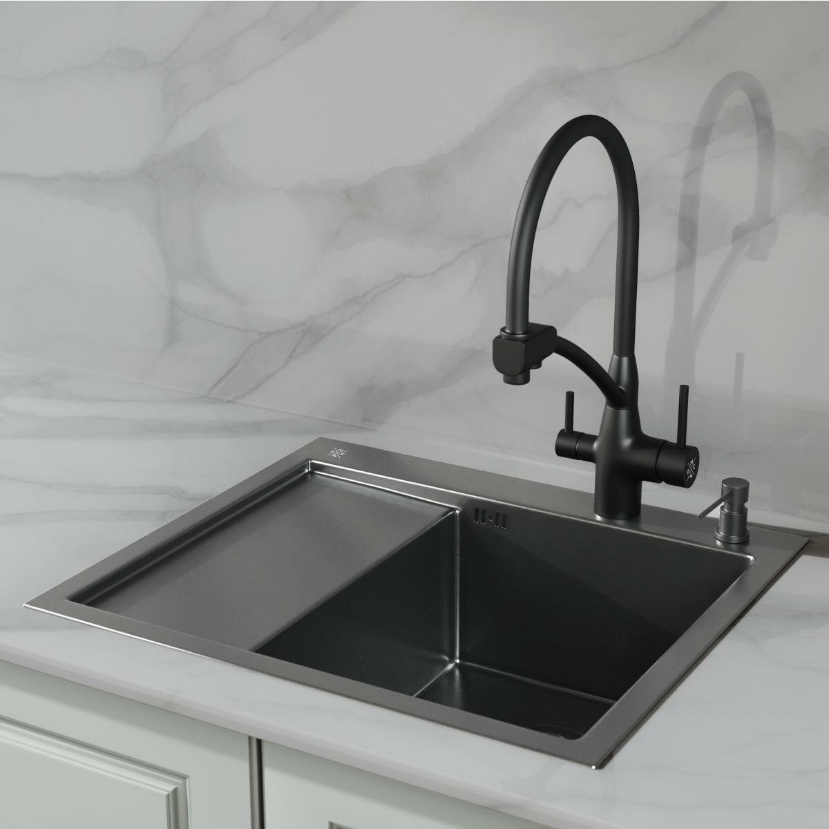Кухонная мойка из нержавеющей стали, РМС MR-5843BL, дозатор, корзина раздвижная для сушки, сифон, PVD покрытие