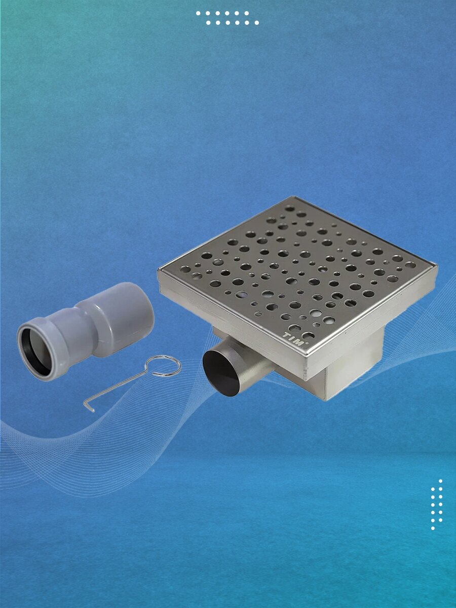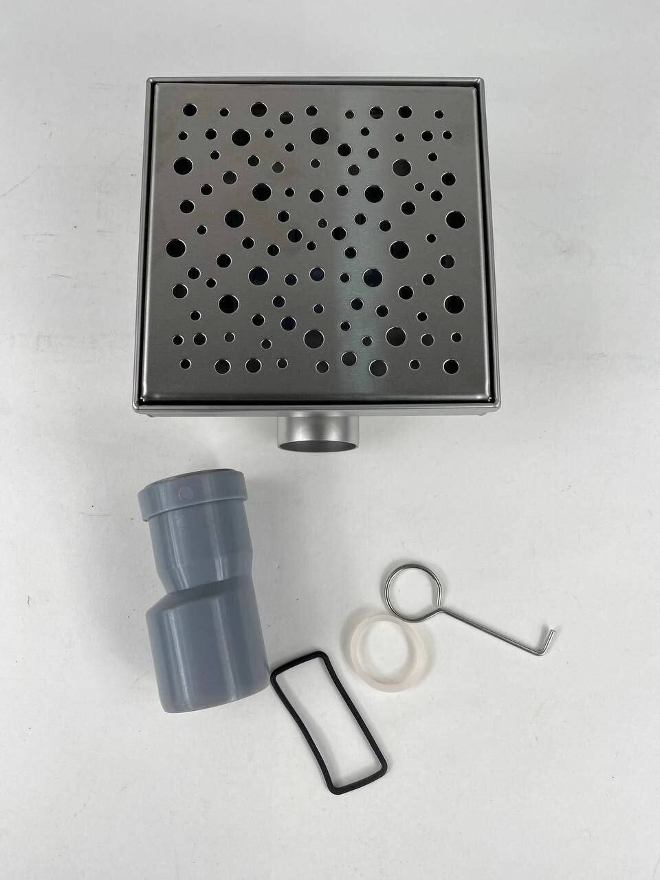 Трап для душа 150х150мм с круглой решёткой и гидрозатвором (сухой), выход горизонтальный/угловой 50мм, с переходником 50х40мм TIM, арт. BAD411502