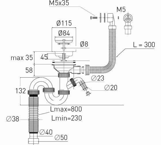 Сифон для мойки большая горловина с переливом, с отводом под сливной шланг и со съёмной корзинкой для мусора