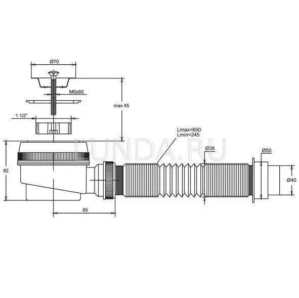| Дополнительная информация | гофротруба: минимальная длина - 245 мм, максимальная - 650 мм; гидрозатвор 55 мм; решетка из нержавеющей стали диаметром 70 мм |