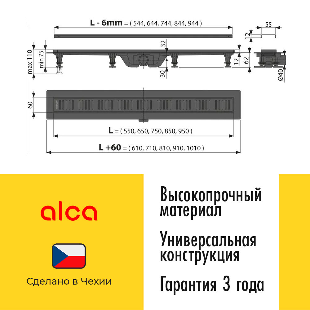 Купить Душевой лоток AlcaPlast с порогами для перфорированной решетки APZ10BLACK-750M
