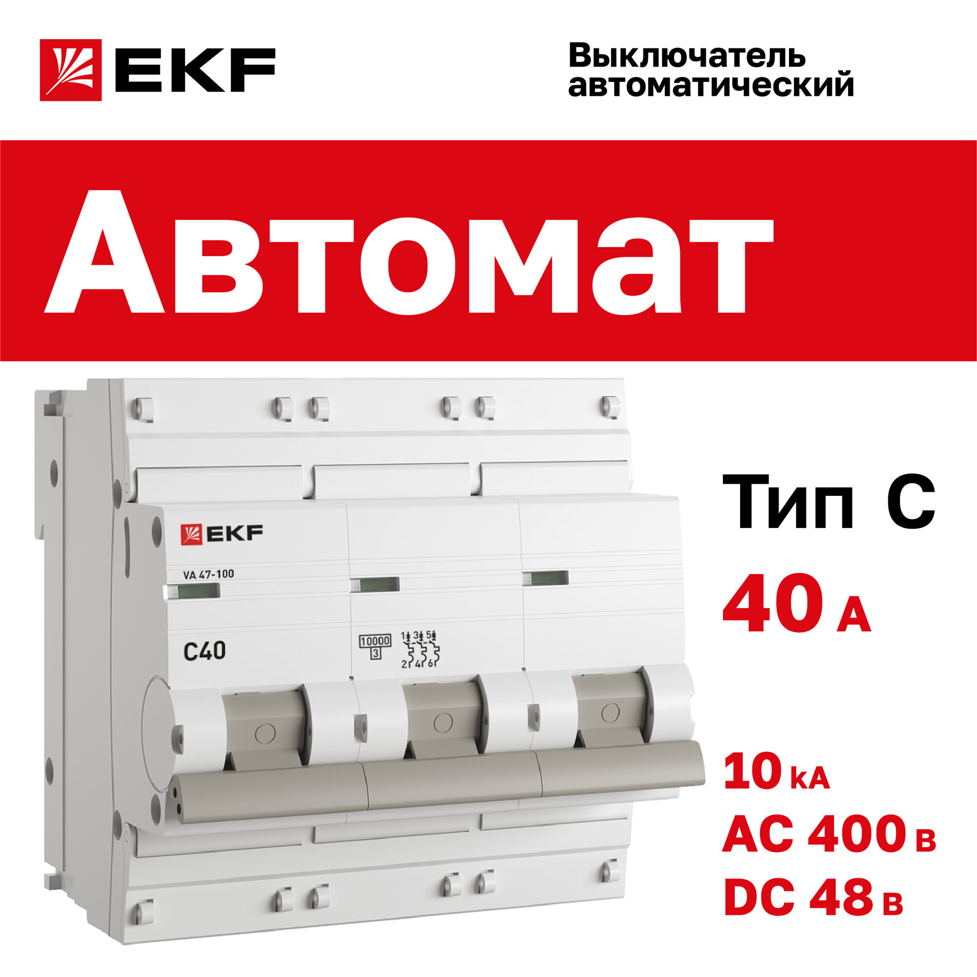Выключатель автоматический трехполюсный 10А C ВА 47-100 10кА PROxima , EKF MCB47100-3-10C-PRO (1 шт.)