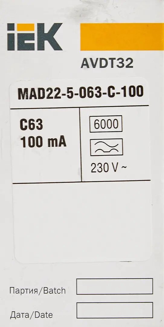 Выключатель автоматический дифференциальный АВДТ 32 1п+N 63А C 100мА тип A. MAD22-5-063-C-100 IEK