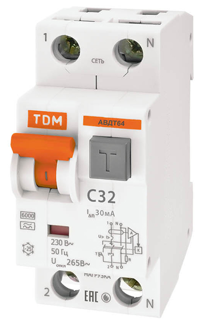 АВДТ 64 2Р(1Р+N) C32 30мА тип А защита 265В TDM