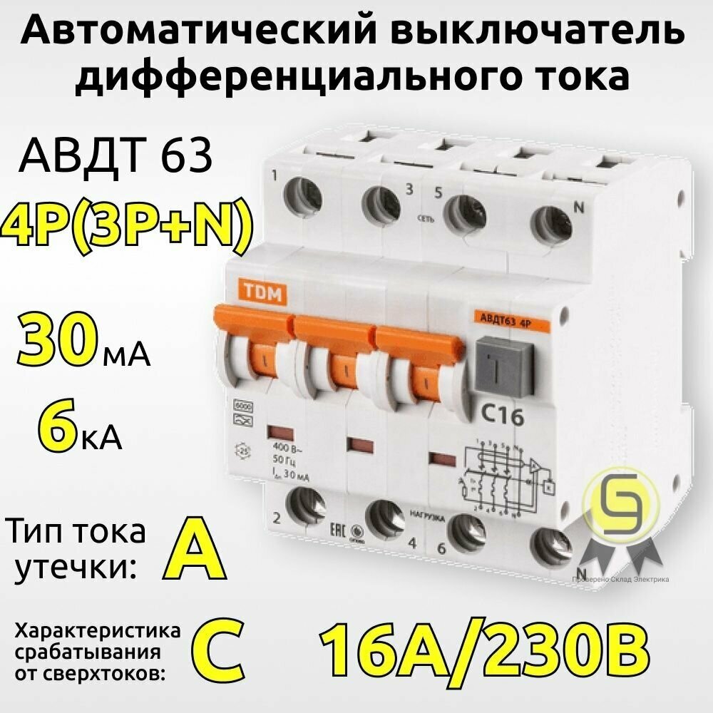 Дифференциальный автоматический выключатель Tdm Electric АВДТ 63, 4Р(3Р+N), C16, 30 мА, 6 кА, тип А интересное: