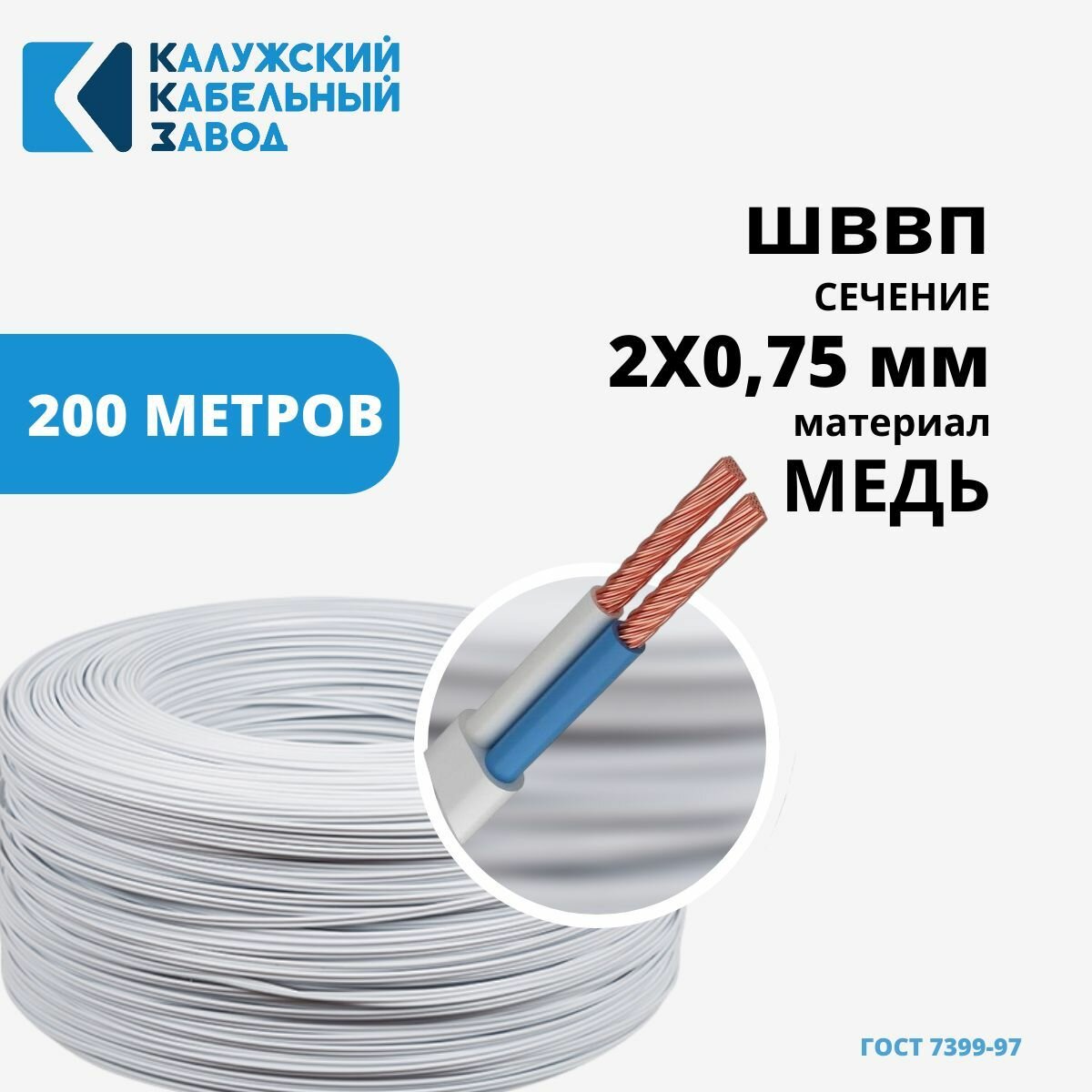 Купить Провод ШВВП 2х0,75 ГОСТ Калужский кабельный завод. Белый. Бухта 200 метров