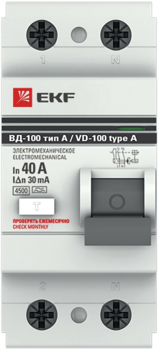 Устройство защитного отключения ВД-100 2P 40А 30мА (тип АС, электромеханическое) 6кА EKF PROxima