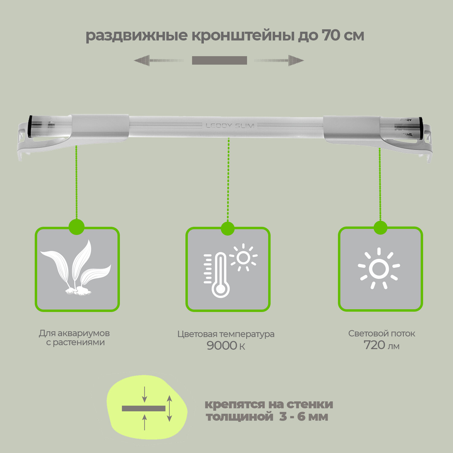 | Дополнительная информация | В LEDDY SLIM 2.0 используются светодиоды, которые обеспечивают идеальное освещение аквариума и оптимальные условия жизни его обитателей, а также создают неповторимый зрительный эффект. Лампы выполнены из коррозиестойкого, легко чистящегося стекла. Крепление на две стенки аквариума. |