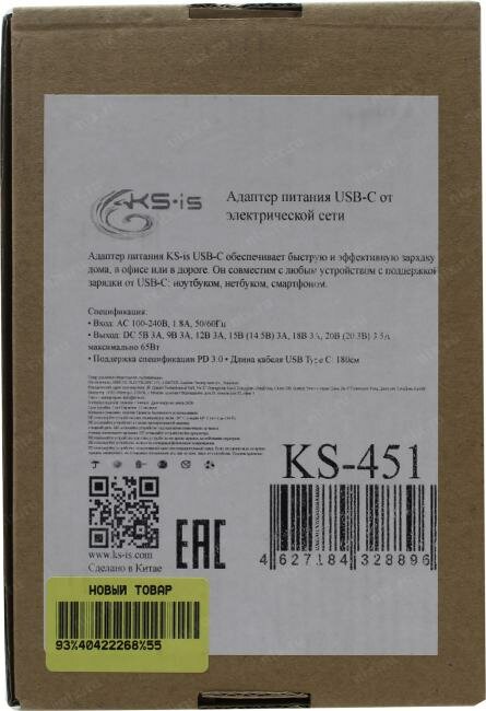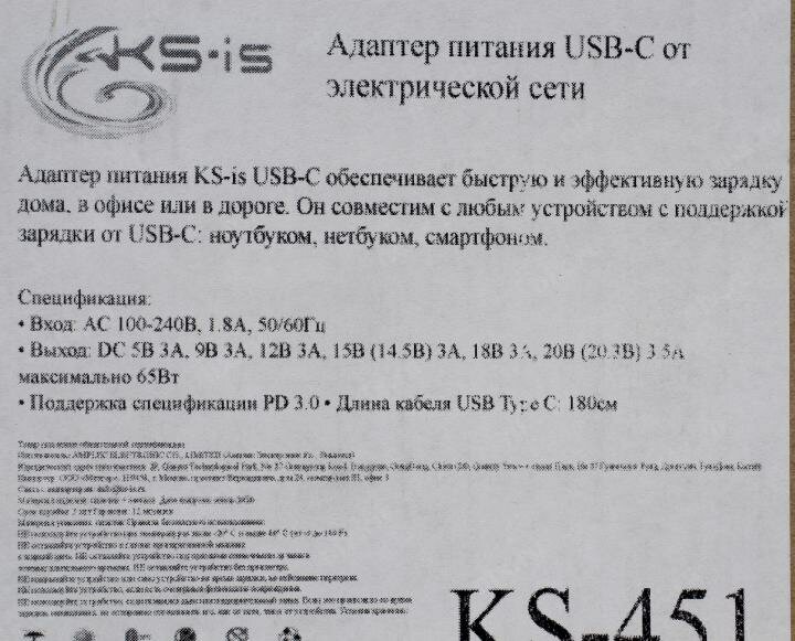 Ниже Вы можете прочитать отзывы на Сетевой адаптер питания KS-is KS-451 зарядка 1 порт USB-C PD/PD2.0 для ноутбуков 65Вт, ознакомится с подробными характеристиками, посмотреть интересные обзоры и фотографии на Сетевой адаптер питания KS-is KS-451 зарядка 1 порт USB-C PD/PD2.0 для ноутбуков 65Вт.