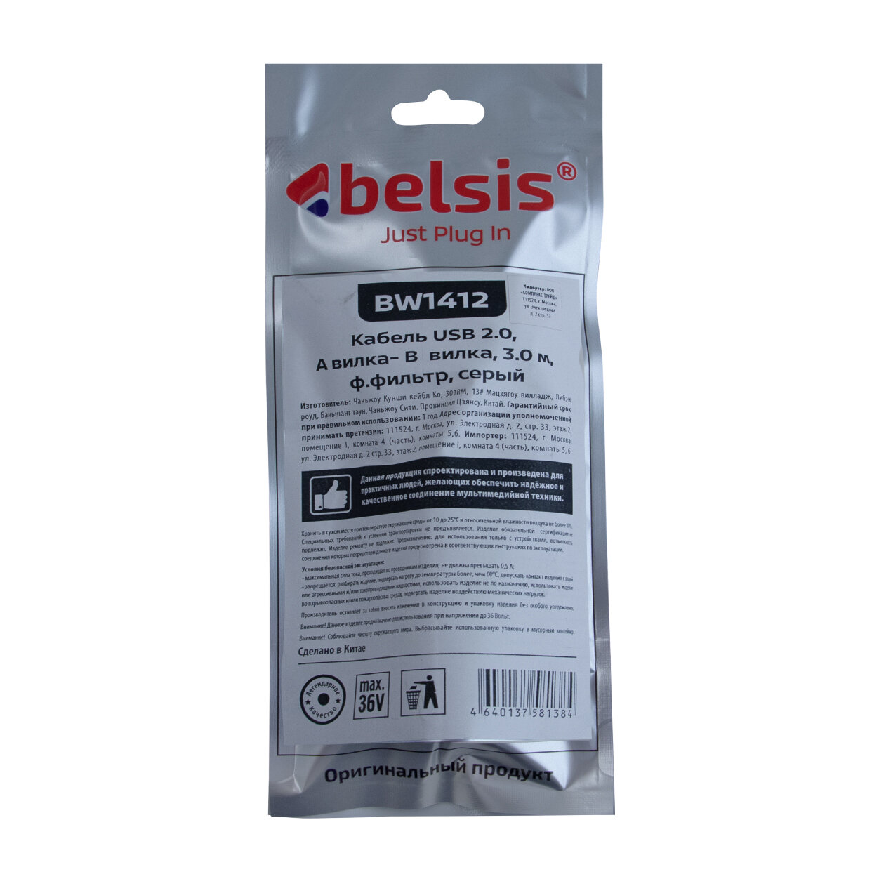 Кабель USB A(M) – USB B(M) Belsis BW1411, ферритовый фильтр, позолоченные контакты, 1.8 метра, v2.0
