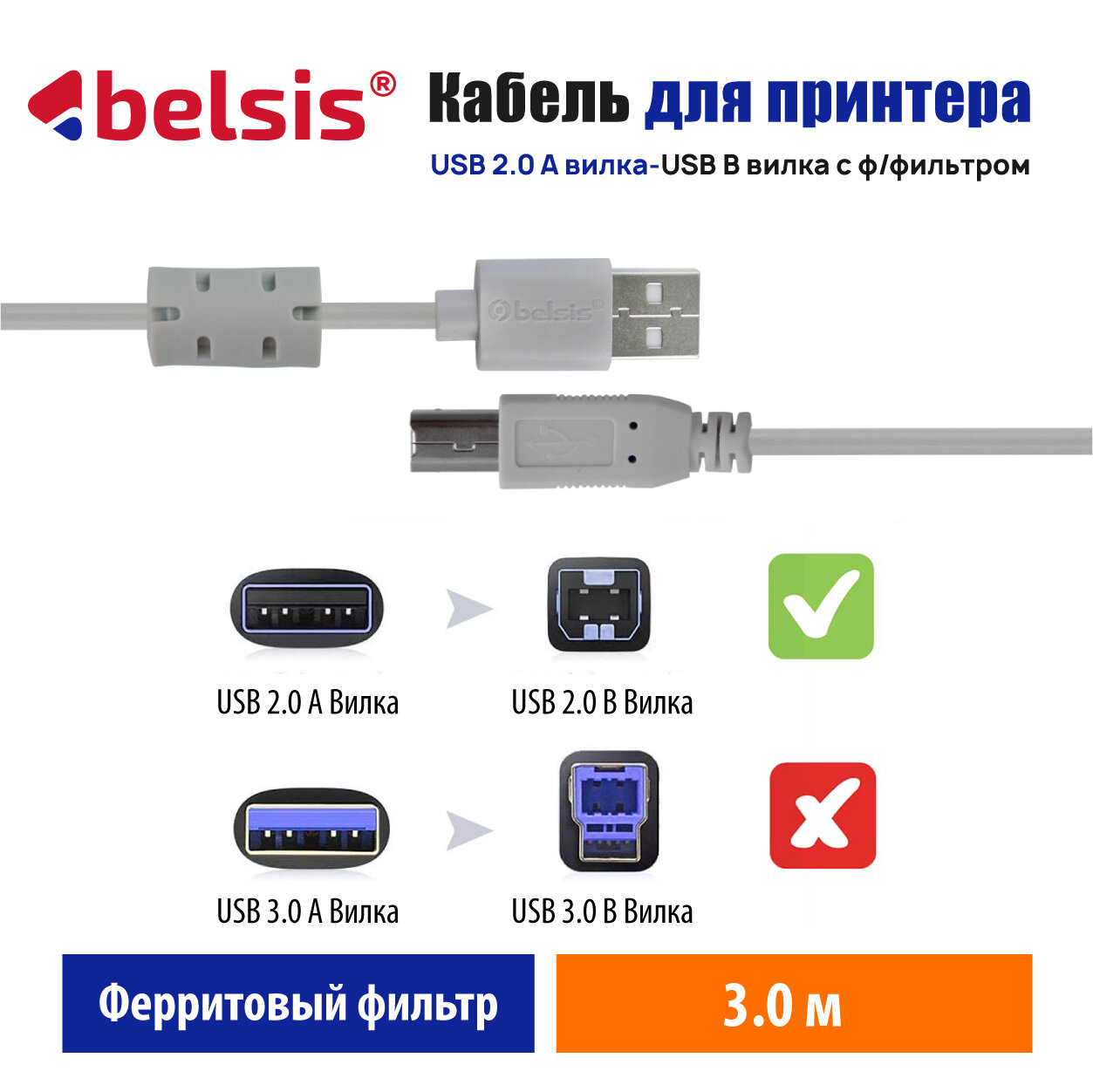 Купить Кабель для принтера USB 2.0 A - B с ферритоовым фильтром,480 Мбт/с , Belsis ,длина 3 метра , для сканера, цифрового пианино, цап и т.д./ BW1412