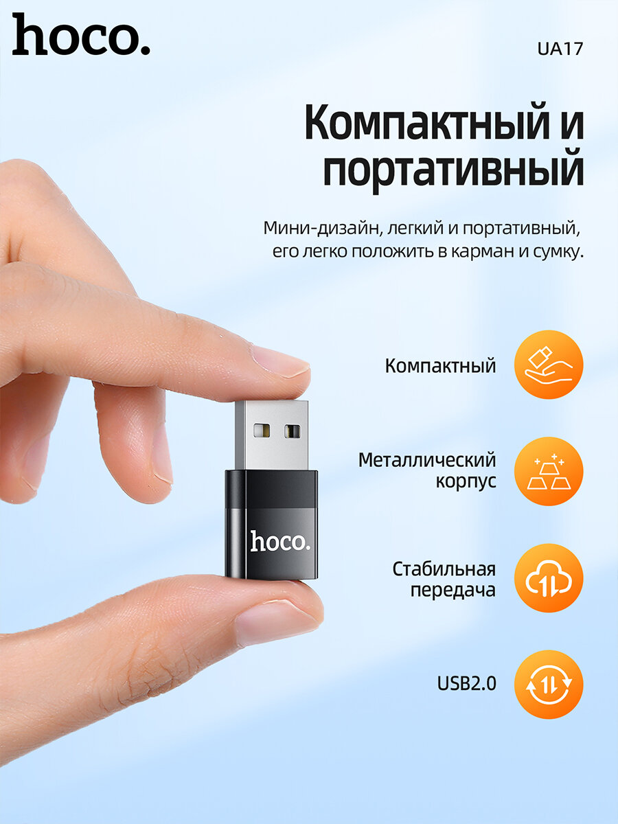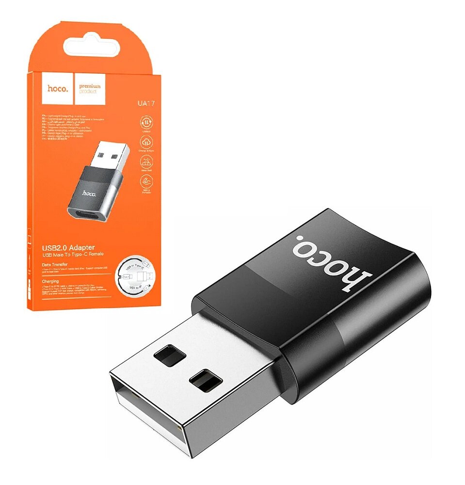 Переходник с USB (папа) на Type-C (Мама), HOCO, UA17, черный