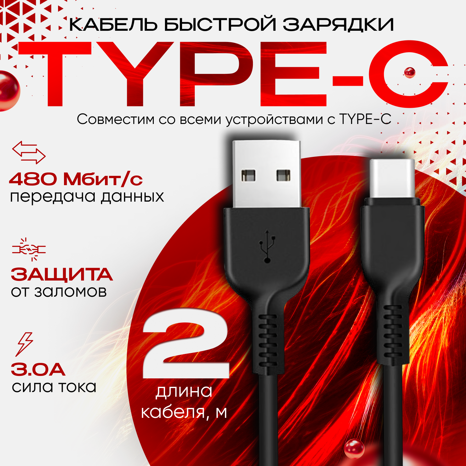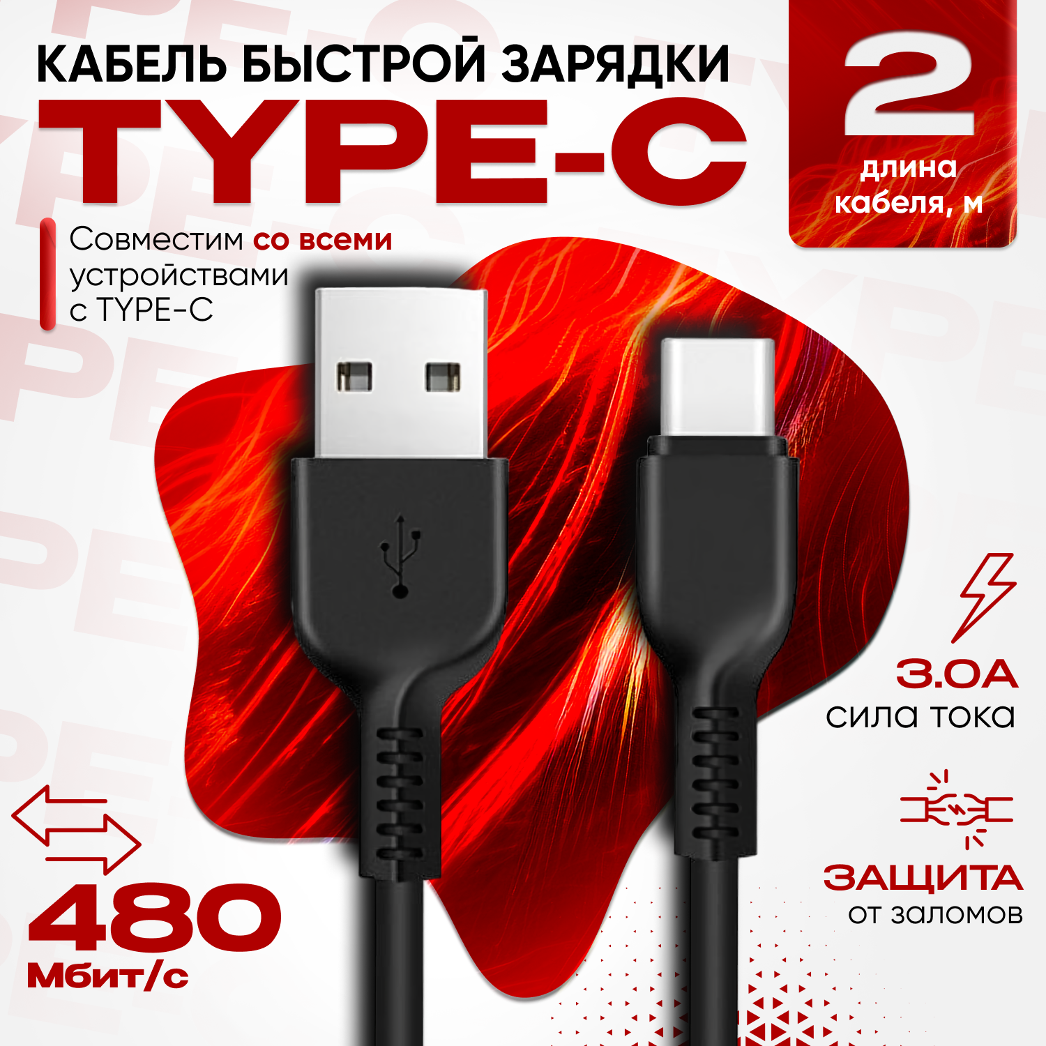 Кабель для зарядки USB Type C 2 метра, быстрая зарядка провод для телефона Honor, Huawei, Samsung, Xiaomi, черный