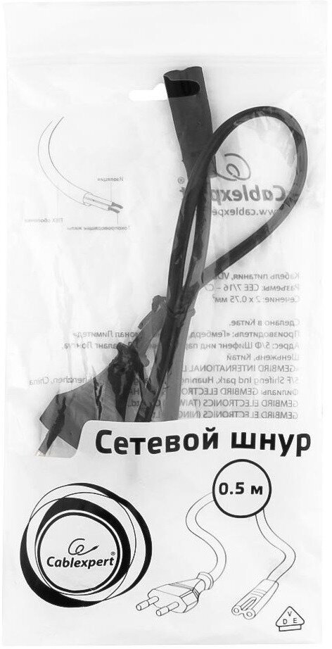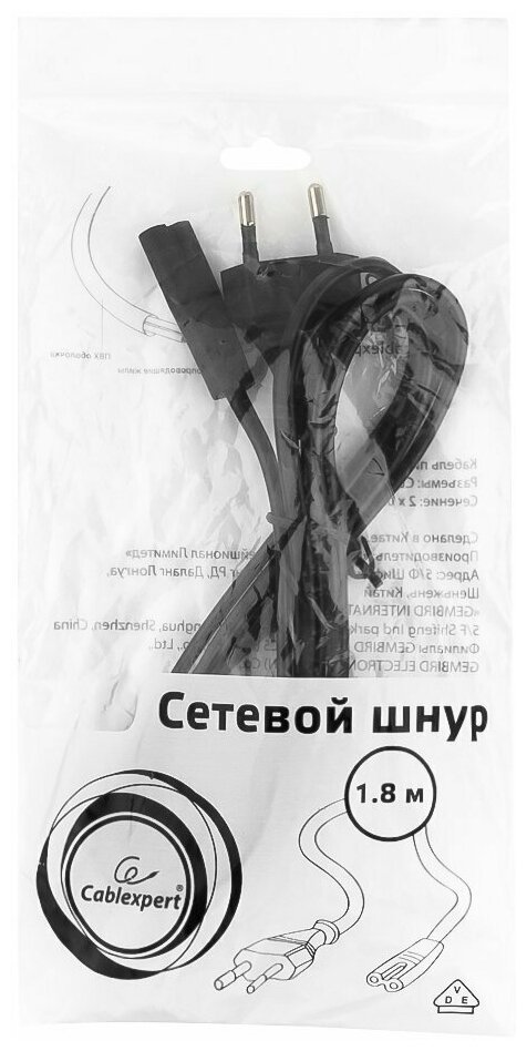 Кабель питания бытовой техники S52 C7 Cablexpert PC-184-VDE-1.8M CEE7/16 восьмёрка 2*0.75мм 220в 6А - 1.8м чёрный