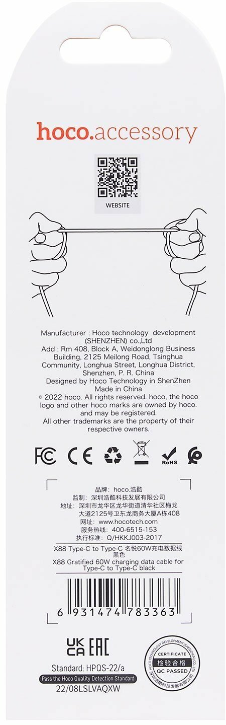 Кабель USB 2.0 type C <-> type C Hoco X88 Gratified