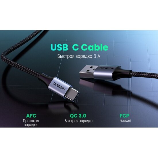 Кабель Ugreen USB A 2.0 - USB C, в оплетке, цвет черный, 1 м (60126)
