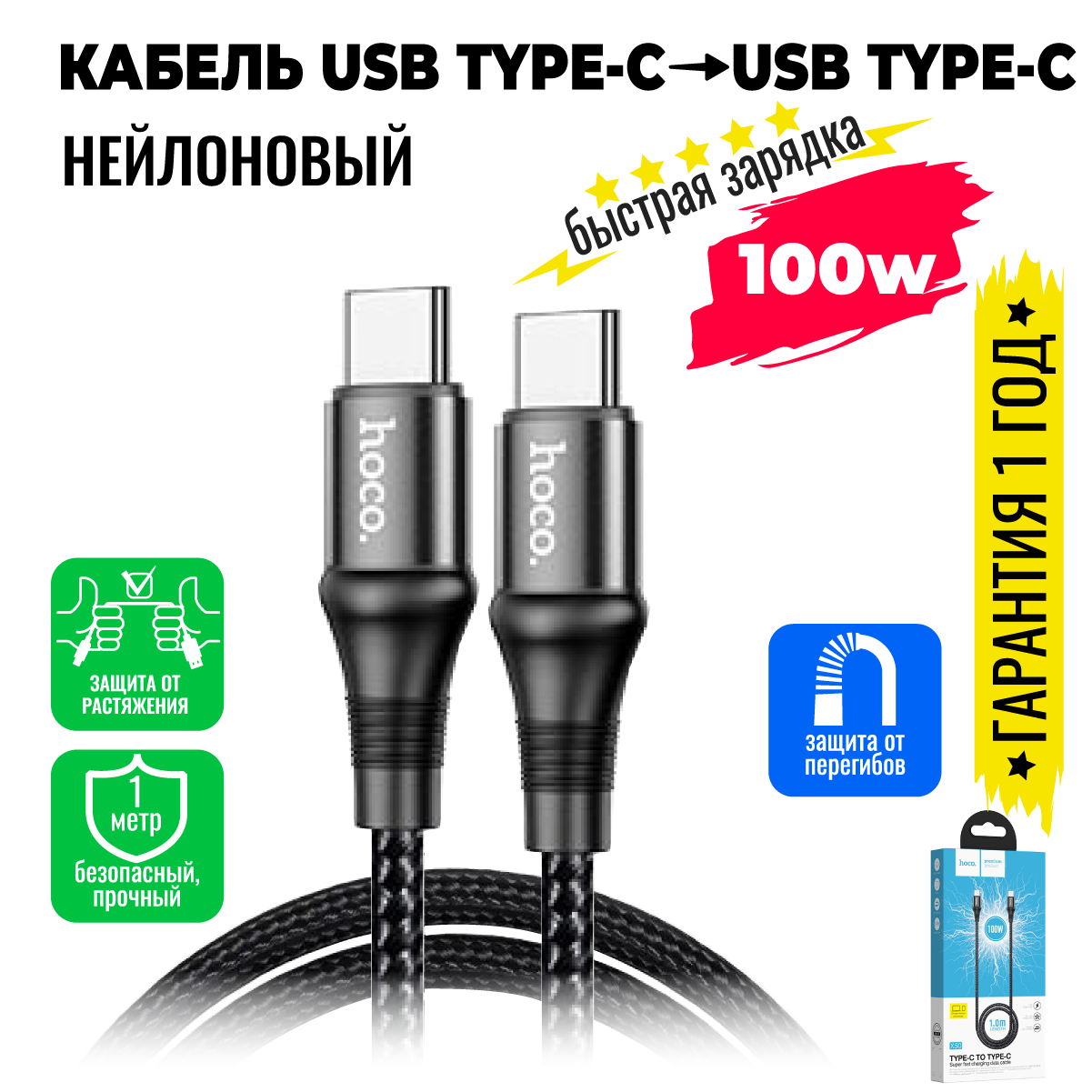 Кабель USB Type C, быстрая зарядка 100W, 2 метра, нейлоновый, передача данных / провод тип с для смартфона, шнур для телефона / Hoco. X50