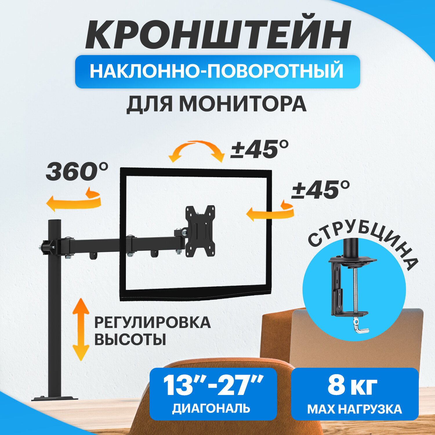 Кронштейн для монитора 13"- 27" дюймов одно колено настольный Cерия Profi 38-0306 . интересное: