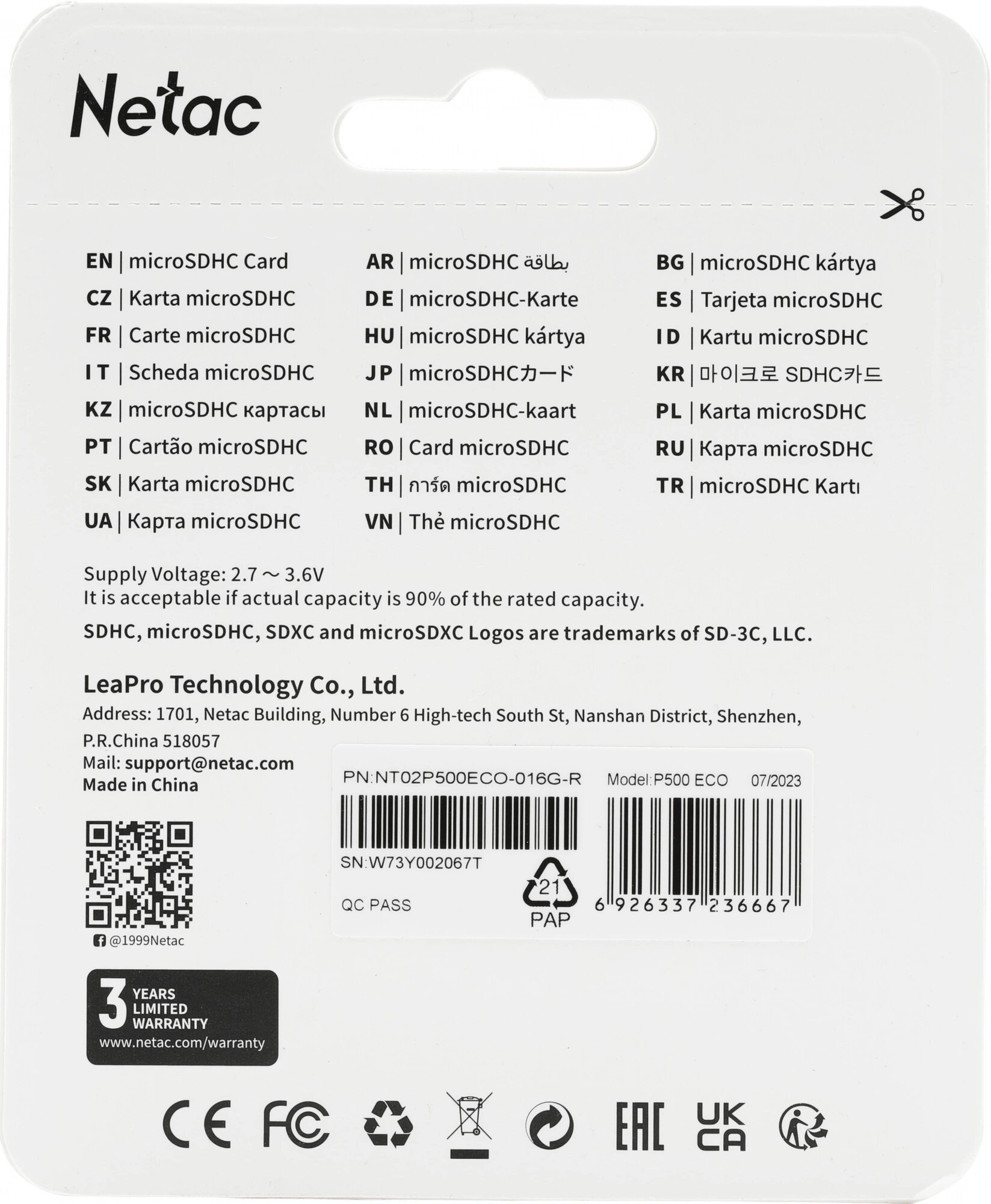 Карта памяти micro SD 16ГБ Netac Class 10 P500 Eco