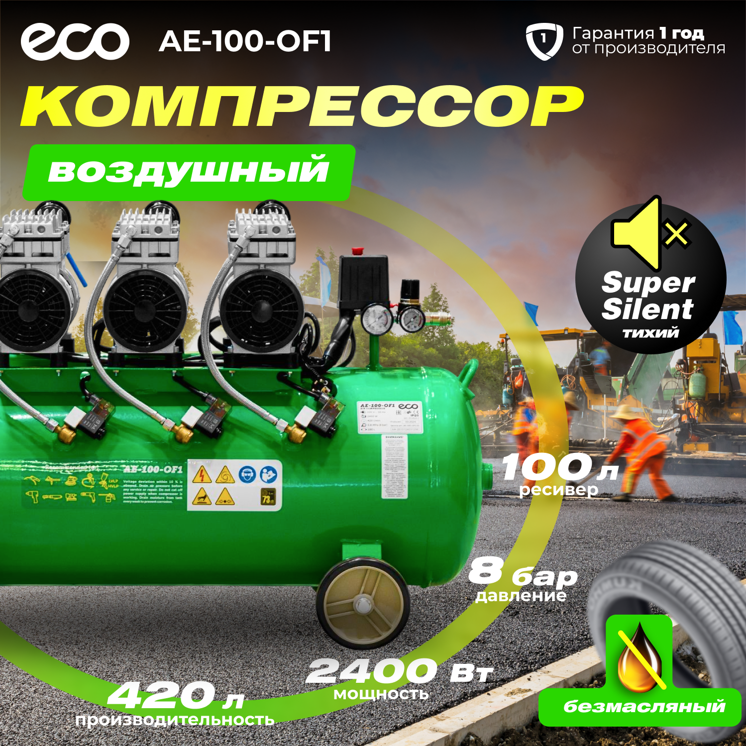 Купить Компрессор воздушный безмасляный ECO AE-100-OF1 (EC2610-1)