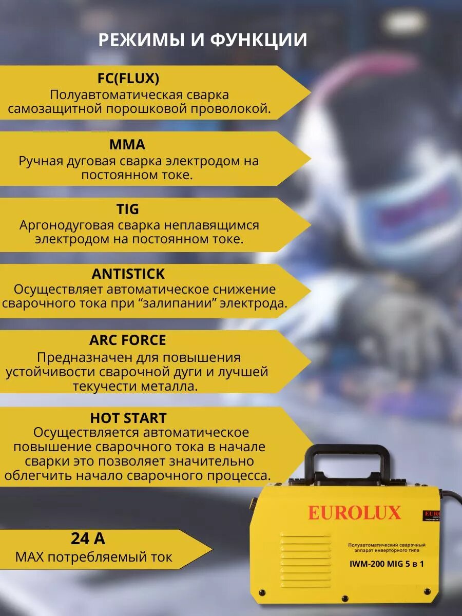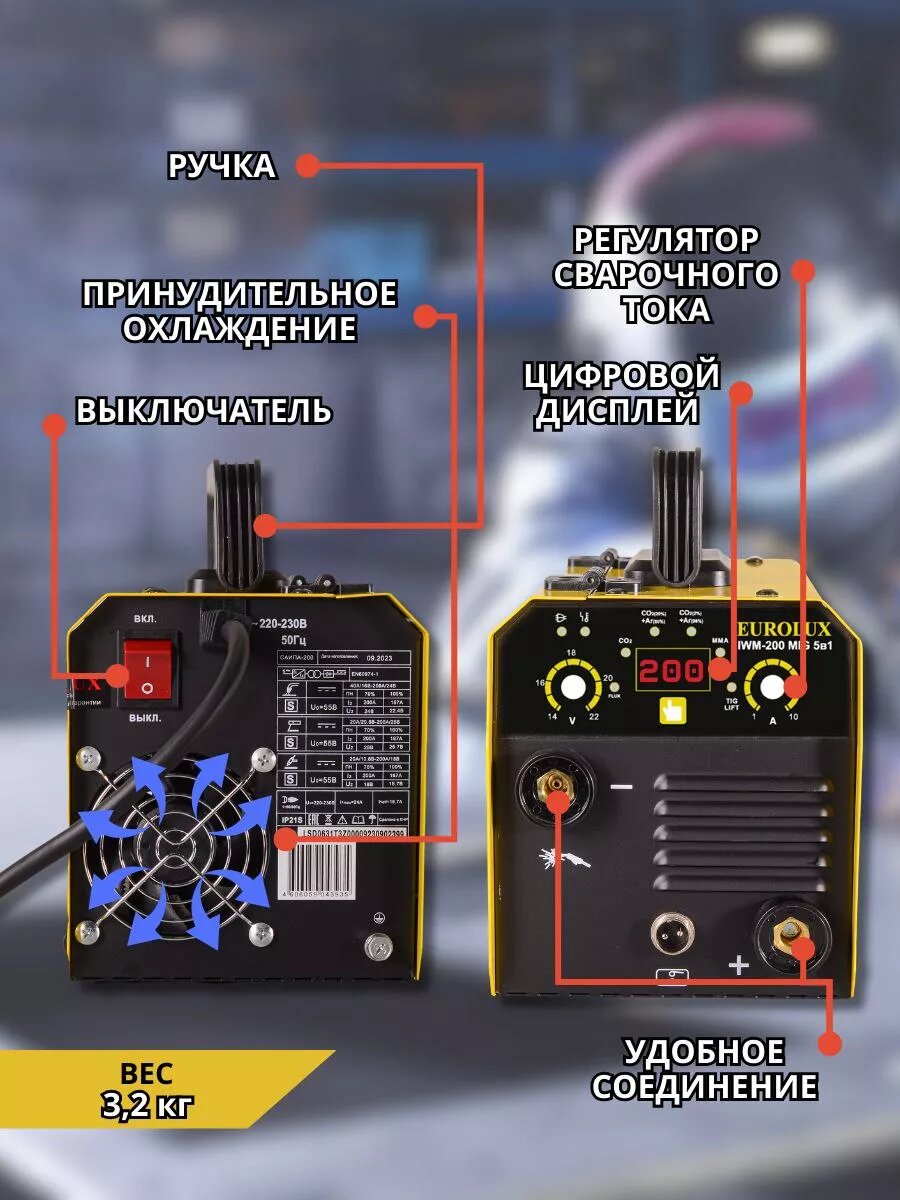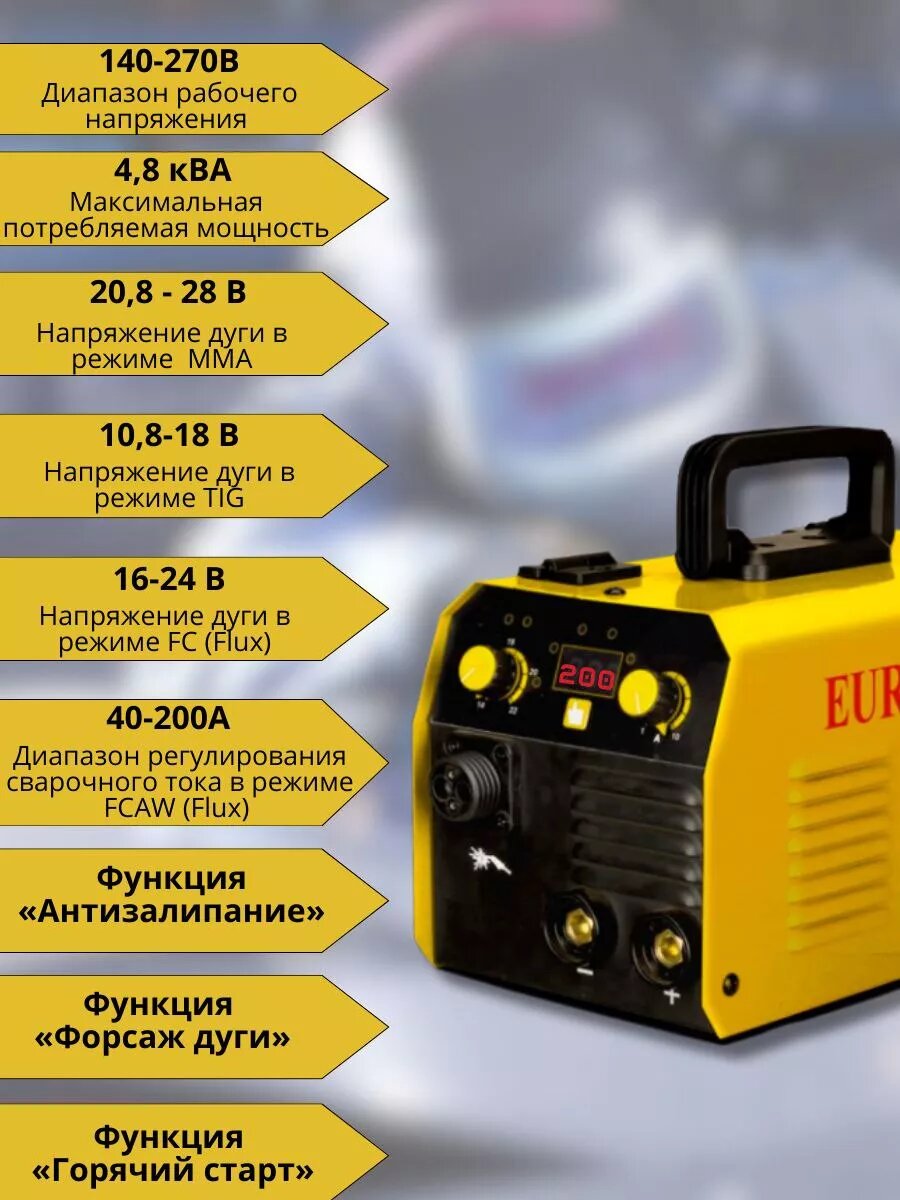 Сварочный полуавтомат Саипа -200 Eurolux инверторный FCAW/MMA/TIG 20-200A интересное:
