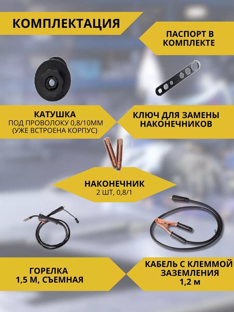 | Комплектация | сварочный аппарат, кабель заземления 1.3м, кабель с электрододержателем 1.5м, сварочная горелка 2м |