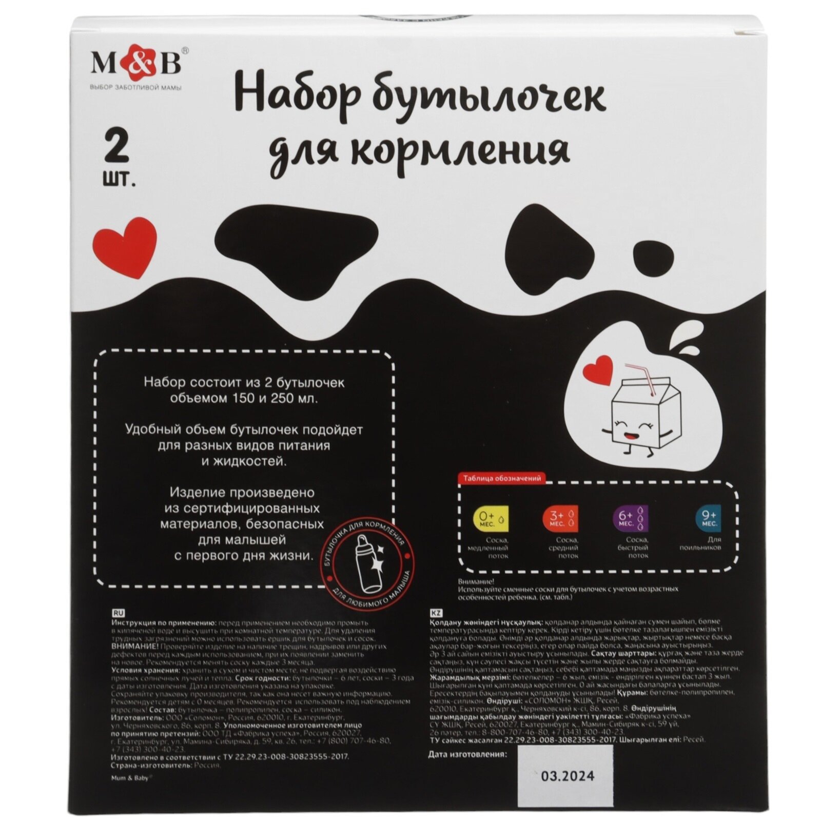 Набор бутылочек для кормления M&B "Люблю молоко" 150 и 250 мл
