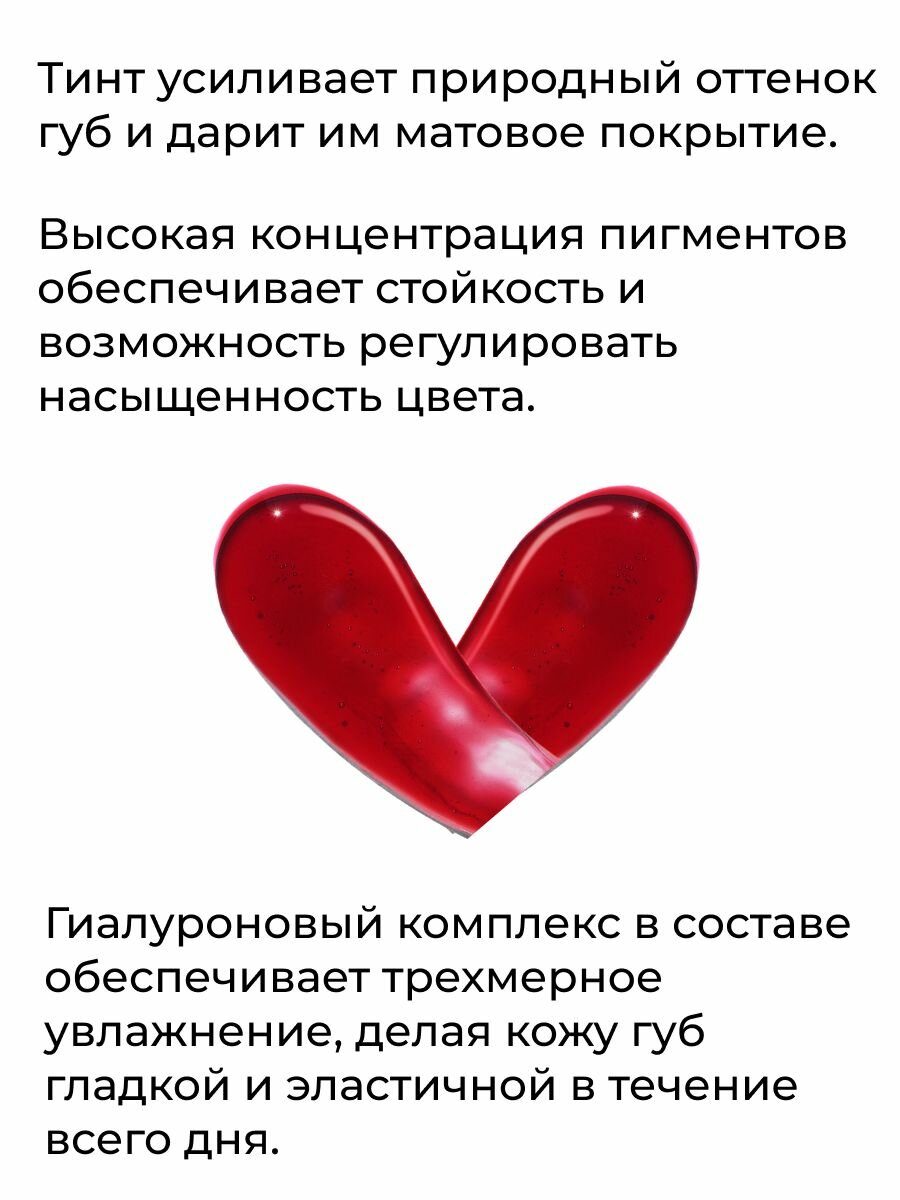 | Дополнительная информация | Тинт для губ на легкой водно-гелевой основе и повышенной концентрацией пигментов придает губам естественный оттенок и матовый финиш, усиливает выразительность и яркость природного цвета губ. Спустя несколько секунд после нанесения жидкая текстура высыхает и впитывается в кожу губ, превращаясь в невесомое полупрозрачное покрытие с эффектом "макияж без макияжа". Благодаря удобному аппликатору оттеночный гель-тинт для губ легко наносится и равномерно распределяется, не растекается за контур. |