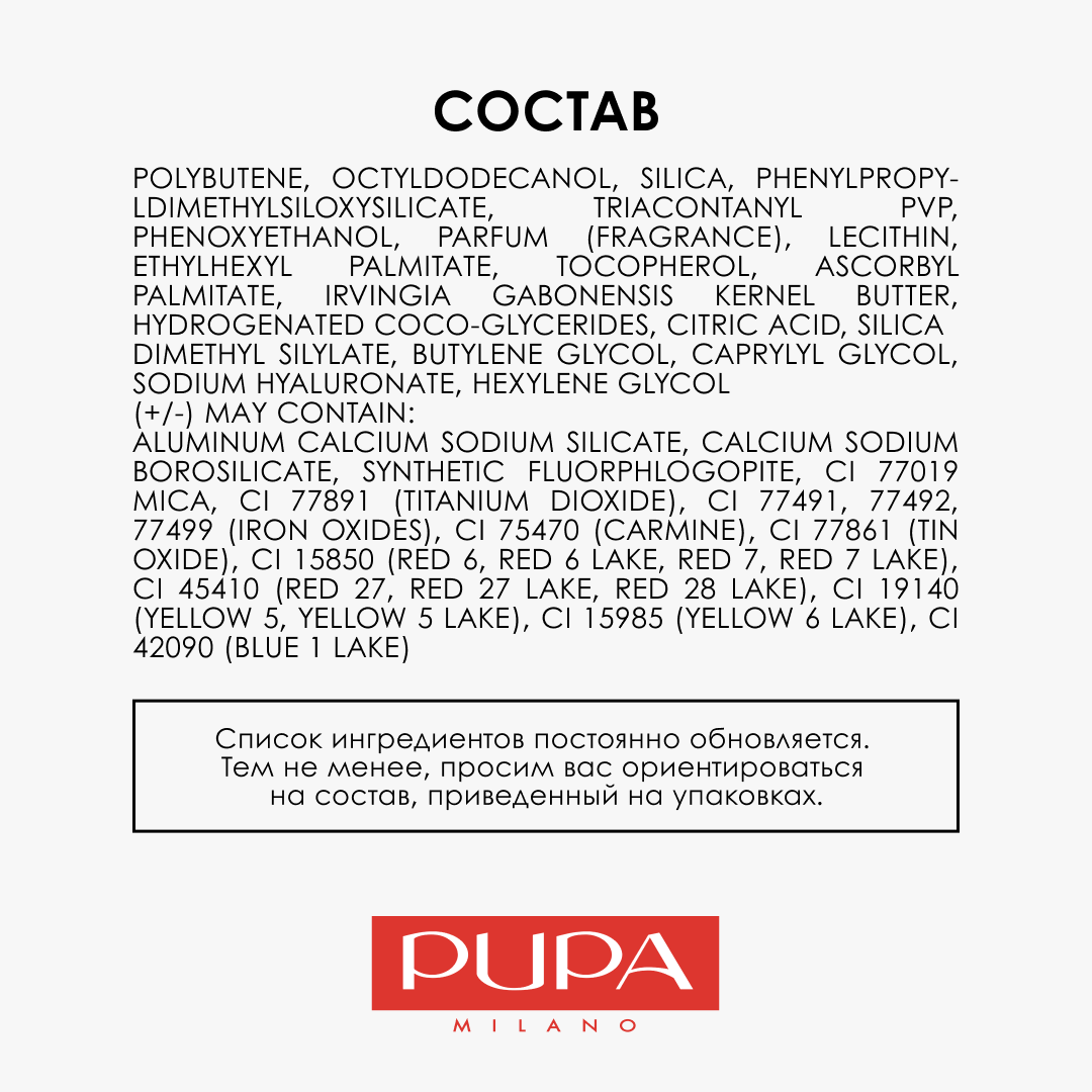 | Состав | polybutene, octyldodecanol, hydrogenated polyisobutene, ethylene, propylene, styrene copolymer, parfum (fragrance), butylene/ethylene/styrene copolymer, tocopheryl acetate, ethylhexyl palmitate, irvingia gabonensis kernel butter, bht, hydrogenated coco-glycerides, silica dimethyl silylate, butylene glycol, caprylyl glycol, phenoxyethanol, sodium hyaluronate, hexylene glycol may contain: aluminum calcium sodium silicate, calcium sodium borosilicate, synthetic fluorphlogopite, ci 77019 mica, ci 77891 (titanium dioxide), ci 77491, 77492, 77499 (iron oxides), ci 75470 (carmine), ci 77861 (tin oxide), ci 15850 (red 6, red 6 lake, red 7, red 7 lake), ci 45410 (red 27, red 27 lake, red 28 lake), ci 19140 (yellow 5, yellow 5 lake), ci 15985 (yellow 6 lake), ci 42090 (blue 1 lake) |